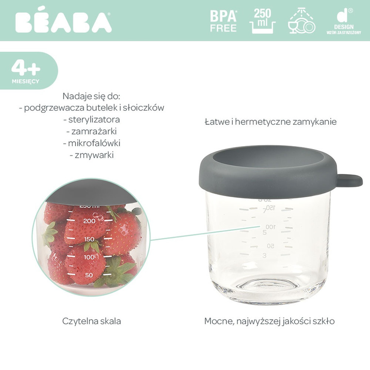 Słoiczek do przechowywania jedzenia francuskiej marki BEABA o pojemności 250 ml, wykonany z najwyższej jakości szkła. Bardzo odporny – nie plami się i nie odkształca. Można w nim nie tylko wygodnie przechować, ale i odmierzać taką ilość żywności, jaka jest potrzebna dziecku – ma widoczną miarkę w ml i oz – uncjach. Nadaje się do zamrażania oraz podgrzewania posiłków, także w mikrofali. Hermetyczna, miękka silikonowa pokrywka doskonale przylega do słoiczka, co pozwala zachować smak oraz aromat jedzenia, co więcej wyprofilowana jest tak, że można stabilnie ustawić takie same pojemniki jeden na drugim, np. w lodówce czy spiżarni. Dzięki specjalnym uchwytom pokrywkę łatwo jest zdjąć.