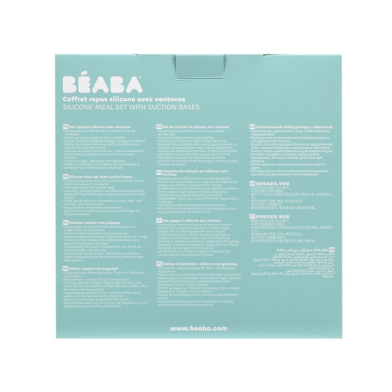 Komplet naczyń z silikonu francuskiej marki BEABA składa się z talerzyka, miseczki, kubka i łyżeczki treningowej. Talerzyk i miseczka posiadają kwadratowy kształt z wysokimi, zaokrąglonymi po bokach brzegami, co wspiera dziecko w nauce samodzielnego jedzenia. Dodatkowo, jedna z krawędzi miseczki jest wyższa i delikatnie zakrzywiona do wewnątrz, co dodatkowo ułatwia dziecku samodzielne nabieranie posiłku na łyżkę. Naczynia mają na spodzie antypoślizgową przyssawkę, dzięki czemu są stabilne i dobrze trzymają się stołu. Kubeczek jest poręczny i wygodny do nauki picia, a łyżeczka idealnie dopasowuje się do dziecięcej buzi i można ją odłożyć tak, by główka nie dotykała powierzchni, dzięki czemu jej używanie jest o wiele bardziej higieniczne.