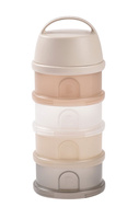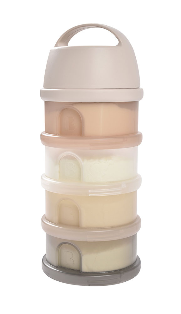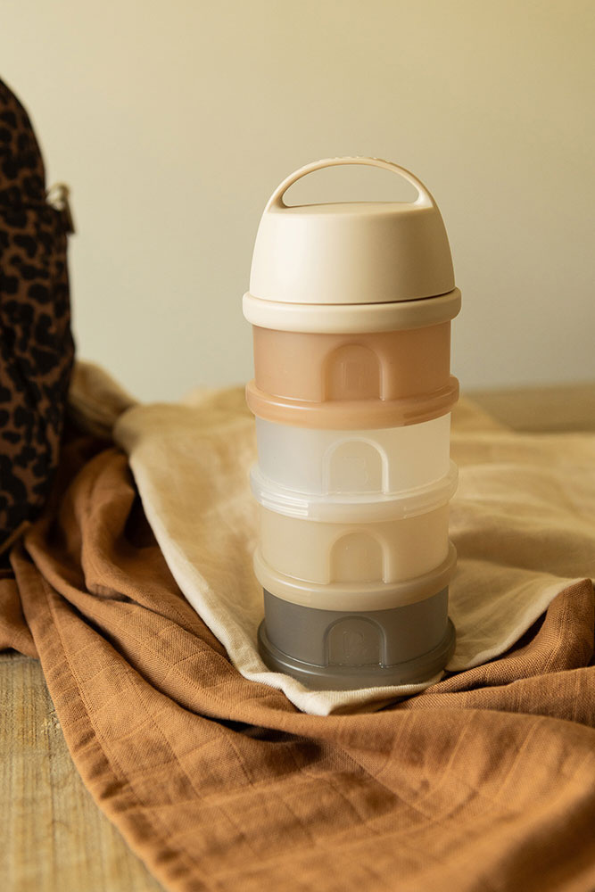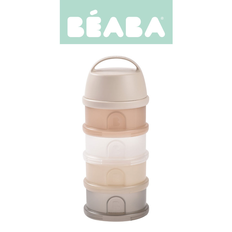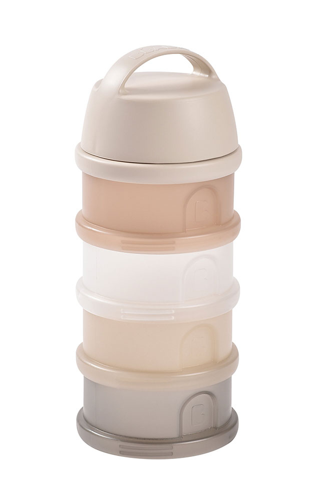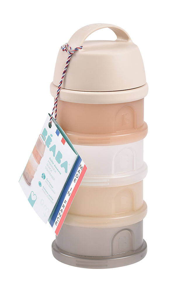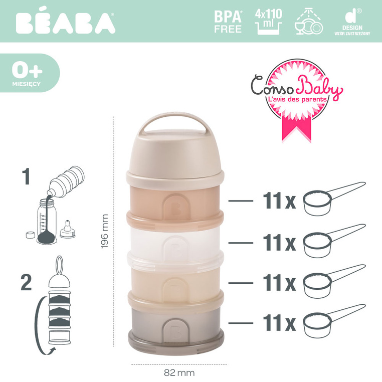 Kompaktowy zestaw 4 pojemników do przechowywania mleka w proszku francuskiej marki BEABA. Półtransparentne pojemniki (ceglany, biały, kremowy i szary) mają pojemność w sumie 440 ml (4x110ml). Zestaw idealny do zabrania mleka w proszku na spacer, podczas podróży czy na nocne karmienia. Każda komora mieści do 11 dawek mleka w proszku. Można w nim odmierzyć porcje nawet na dobę do przodu. Pojemniczki są na tyle szerokie, że łatwo się je napełnia i czyści. Nakręca się je jeden na drugi, ale można ich także używać osobno, w zależności od potrzeb. Dodatkowa nakrętka z wąskim otworem/lejkiem ułatwia przesypanie mleka do butelki. Pokrywka jest hermetyczna i ma wygodny uchwyt do przenoszenia. Pojemniki z czasem mogą również służyć jako poręczne pudełka na przekąski.