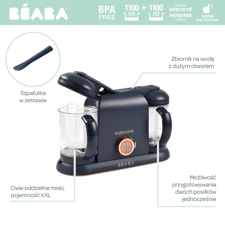 Wielofunkcyjne urządzenia do miksowania i gotowania na parze Babycook® francuskiej marki Beaba w wersji duo, czyli z dwoma dzbankami pozwoli przygotować pełny posiłek dla dziecka – od przystawek przez obiad do deseru – w niespełna 15 minut. Babycook® oferuje 6 funkcji w 1: gotuje na parze, miksuje, rozmraża, podgrzewa posiłki i butelki oraz sterylizuje małe butelki, a do tego jest cichy i łatwy w obsłudze.