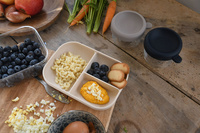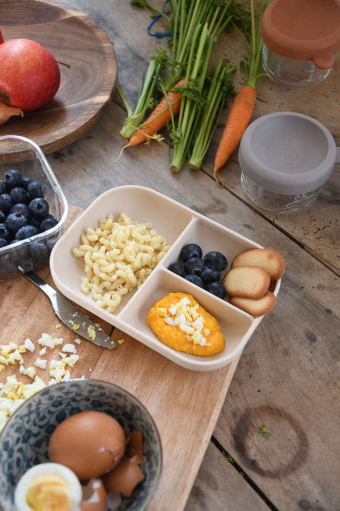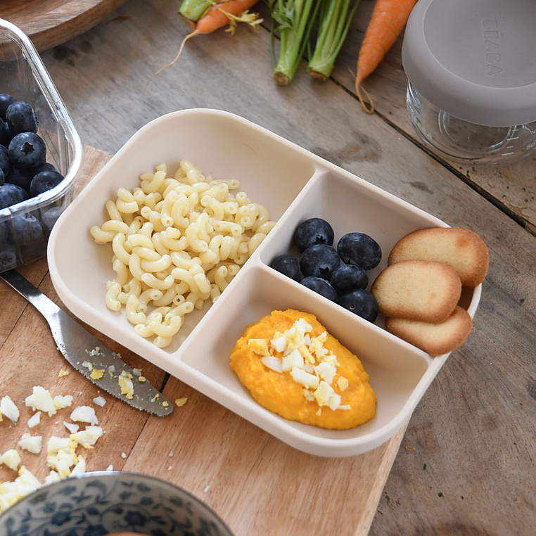 Silikonowy trójdzielny talerzyk z silikonu francuskiej marki BEABA zaprojektowany z myślą o wygodzie i samodzielności malucha. Posiada ergonomiczny, zaokrąglony kształt i miękkie, gładkie brzegi. Podział na trzy przegrody (150 ml + 90 ml + 90 ml) ułatwia porcjowanie posiłków i pomaga w nauce samodzielnego jedzenia oraz prawidłowym komponowaniu dań. Wyższe ścianki ułatwiają nabieranie jedzenia, a antypoślizgowa przyssawka na spodzie zapewnia stabilność i zapobiega przesuwaniu się talerzyka na stole.