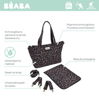 Funkcjonalna i ponadczasowa torba dla mam francuskiej marki BEABA. Ma aż 11 kieszonek, dzięki czemu pomieści bez trudu niezbędne dziecięce akcesoria i wygodnie je posegregujesz. Torbę i dołączone do niej akcesoria zdobi modny print w lamparcie cętki. Ma ona uniwersalny krój typu shopper i jest doskonałym kobiecym dodatkiem. Zapakujesz do niej również: telefon, długopis, notatnik czy klucze.