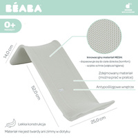 Innowacyjna wkładka - leżaczek do kąpieli niemowląt, francuskiej marki BEABA. Do stosowania od pierwszych dni życia maluszka do momentu, w którym dziecko zacznie samodzielnie siadać. Utrzymana w łagodnej szaro-niebieskiej kolorystyce. Pochylona pozycja odpowiada potrzebom niemowląt – zapewnia wygodę, swobodę ruchów i bezpieczeństwo podczas kąpieli. Leżaczek jest bardzo stabilny, pokryty materiałem MESH, który idealnie dopasowuje się do ciała dziecka, gwarantując mu maksymalny komfort, bez uwierania. Dodatkowo, schnie bardzo szybko, co ułatwia zachowanie higieny. Po włożeniu do wanny, tkanina natychmiast przybiera temperaturę wody, nie jest zatem zimna w kontakcie ze skórą.