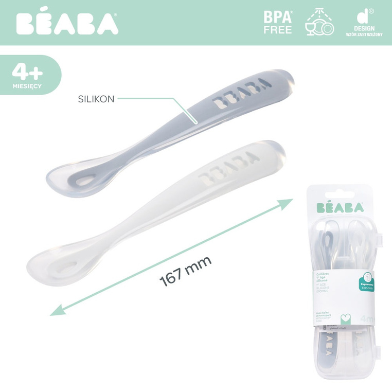 Zestaw dwóch ergonomicznych pierwszych łyżeczek dziecka francuskiej marki BEABA. Jedna w kolorze białym, druga w kolorze szarym, obie z transparentnymi brzegami. Miękkie końcówki łyżeczek wykonane zostały z ultraelastycznego silikonu, w pełni bezpiecznego dla delikatnych dziąseł maluszka. Ich kształt został zaprojektowany tak, by ułatwiał malcowi przejście ze smoczka na łyżkę. Długość uchwytu sprawia, że łyżeczki nadają się również do jedzenia pokarmów ze słoiczka. Uchwyt ten jest ponadto zaprojektowany do trzymania przez dorosłe ręce, podczas karmienia dziecka. Łyżki łatwo się czyści, można je myć ręcznie lub w zmywarce.