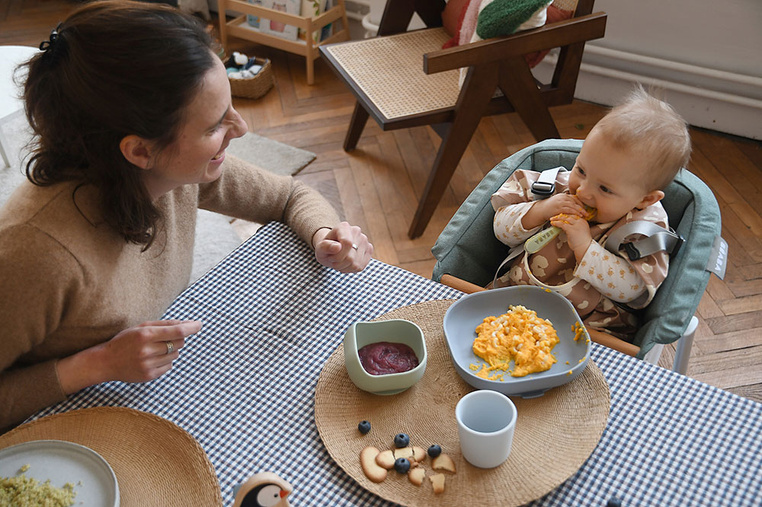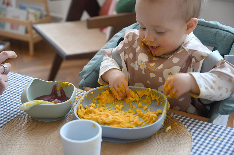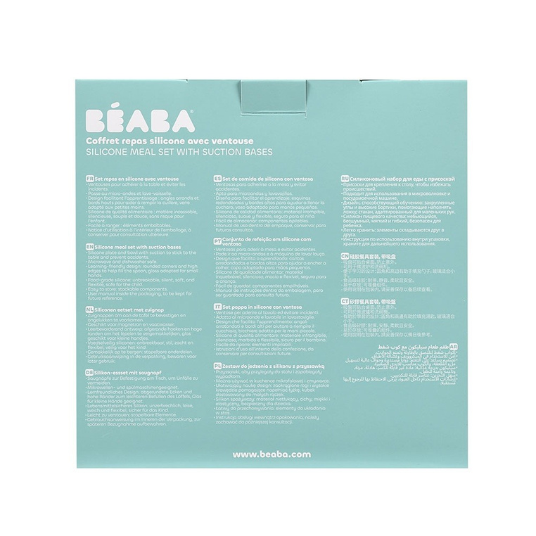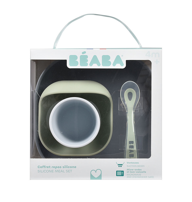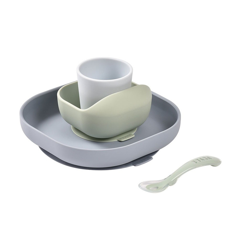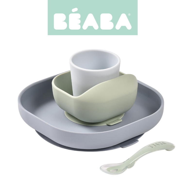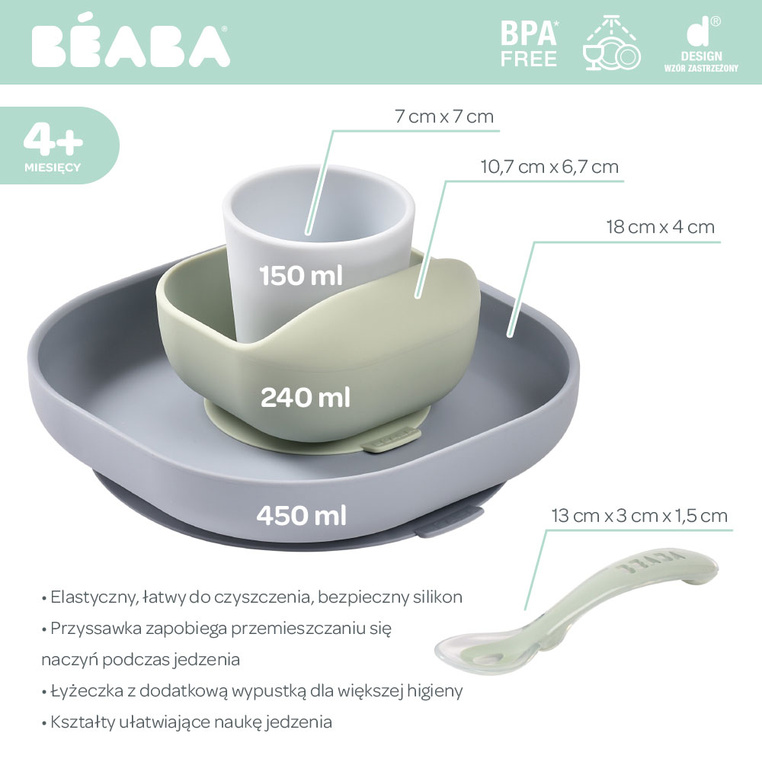 Komplet naczyń z silikonu francuskiej marki BEABA składa się z talerzyka, miseczki, kubka i łyżeczki treningowej. Talerzyk i miseczka posiadają kwadratowy kształt z wysokimi, zaokrąglonymi po bokach brzegami, co wspiera dziecko w nauce samodzielnego jedzenia. Dodatkowo, jedna z krawędzi miseczki jest wyższa i delikatnie zakrzywiona do wewnątrz, co dodatkowo ułatwia dziecku samodzielne nabieranie posiłku na łyżkę. Naczynia mają na spodzie antypoślizgową przyssawkę, dzięki czemu są stabilne i dobrze trzymają się stołu. Kubeczek jest poręczny i wygodny do nauki picia, a łyżeczka idealnie dopasowuje się do dziecięcej buzi i można ją odłożyć tak, by główka nie dotykała powierzchni, dzięki czemu jej używanie jest o wiele bardziej higieniczne.