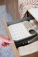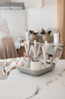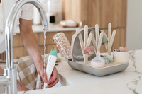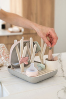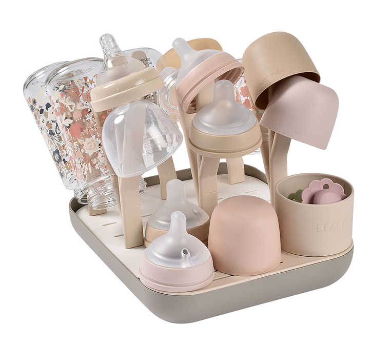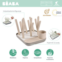 Ultrapraktyczna modułowa suszarka do naczyń, butelek i akcesoriów do karmienia francuskiej marki BEABA. Ma designerski wygląd i stonowane kolory: biały, kremowy i ceglany. Na tacce można w wybranym miejscu dowolnie konfigurować pałąki do suszenia – 3 pojedyncze i 3 potrójne „drzewka”, które pomieszczą łącznie do 6 butelek jednocześnie. Boczna tacka ma podłużne odpływy i miejsce na drobne akcesoria (smoczki, nakrętki, przykrywki itp.) oraz kubeczek na np. sztućce. Ergonomiczny kształt suszarki ułatwia cyrkulację powietrza, więc rzeczy schną szybko, natomiast woda ocieka przez podłużne otwory na podstawkę, którą można szybko i wygodnie opróżnić. Ponadto suszarka jest kompaktowa - nie zajmuje dużo miejsca na kuchennym blacie i jest łatwa w przechowywaniu. Całość zaprojektowana została tak, by zapewnić możliwie jak najwyższą higienę i komfort użytkowania. Wszystkie elementy można myć ręcznie lub w zmywarce.