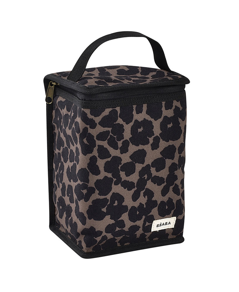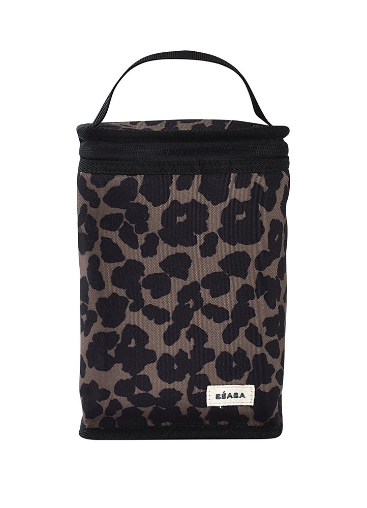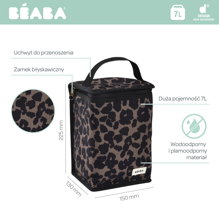 Praktyczna torba izotermiczna francuskiej marki BEABA do przechowywania i przenoszenia posiłków w butelkach, słoiczkach czy innych pojemnikach – ma 22 cm wysokości. Doskonale sprawdzi się na spacerze czy w podróży. Izolowane wnętrze utrzymuje ciepło lub zimno przez kilka godzin. Torbę zdobi modny print w lamparcie cętki.