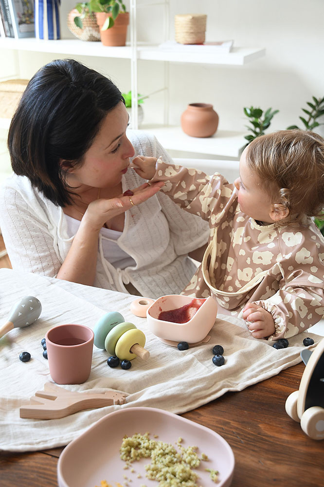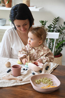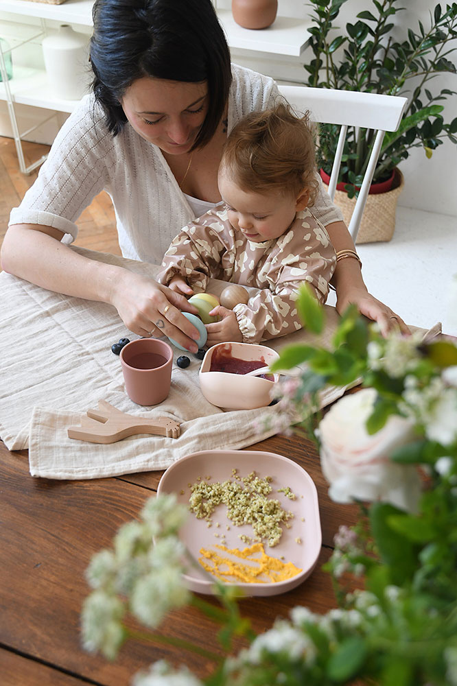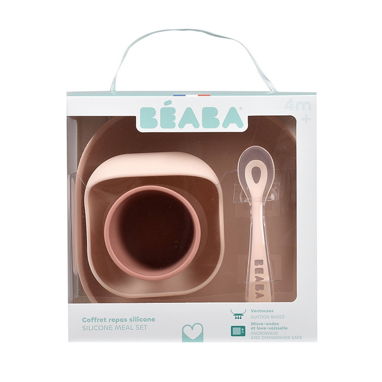 Komplet naczyń z silikonu francuskiej marki BEABA składa się z talerzyka, miseczki, kubka i łyżeczki treningowej. Talerzyk i miseczka posiadają kwadratowy kształt z wysokimi, zaokrąglonymi po bokach brzegami, co wspiera dziecko w nauce samodzielnego jedzenia. Dodatkowo, jedna z krawędzi miseczki jest wyższa i delikatnie zakrzywiona do wewnątrz, co dodatkowo ułatwia dziecku samodzielne nabieranie posiłku na łyżkę. Naczynia mają na spodzie antypoślizgową przyssawkę, dzięki czemu są stabilne i dobrze trzymają się stołu. Kubeczek jest poręczny i wygodny do nauki picia, a łyżeczka idealnie dopasowuje się do dziecięcej buzi i można ją odłożyć tak, by główka nie dotykała powierzchni, dzięki czemu jej używanie jest o wiele bardziej higieniczne.