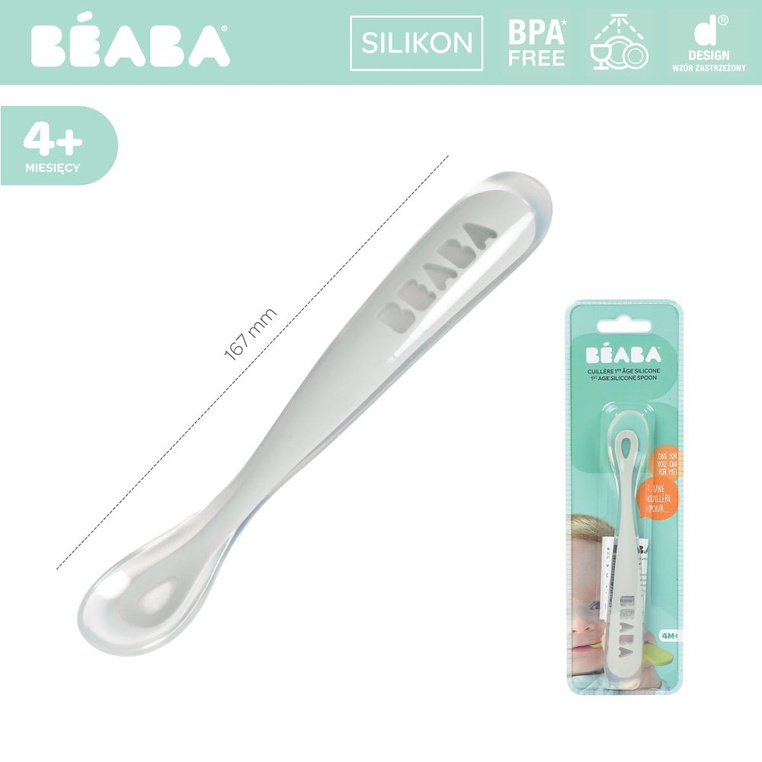 Ergonomiczna pierwsza łyżeczka dziecka francuskiej marki BEABA. Łyżeczka w jasnoszarym kolorze z transparentnymi brzegami. Miękka końcówka wykonana została z ultra elastycznego silikonu, w pełni bezpiecznego dla delikatnych dziąseł maluszka. Jej kształt został zaprojektowany tak, by ułatwiał malcowi przejście ze smoczka na łyżkę. Długi uchwyt sprawia, że łyżeczka jest bardzo wygodna do trzymania przez osobę dorosłą podczas karmienia dziecka, nadaje się również do podawania pokarmów ze słoiczka. Łyżka łatwo się czyści, można ją myć ręcznie lub w zmywarce.